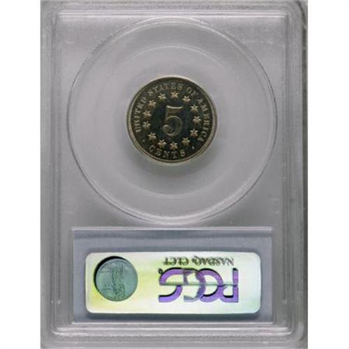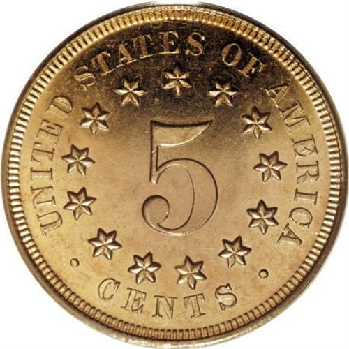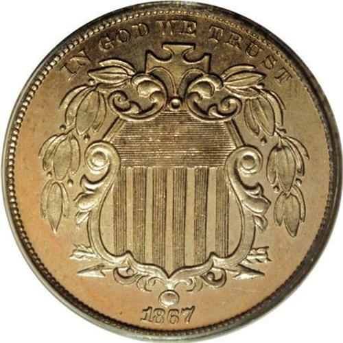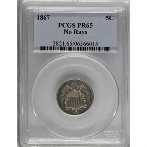 <B>1867 5C No Rays PR65 PCGS.</B></I> Consistent light gold toning graces this intricately struck and undisturbed Gem. Rays were removed from the design in 1867 to extend the die life. The hard nickel alloy planchets were more difficult to coin than their silver half dime predecessors. Only 600+ proofs were struck. Population: 32 in 65, 7 finer (6/07).<BR><BR><B>Coin Engraver:</B> James B. Longacre<BR><BR><b>Shipping:</b> Coins & Currency (<a target="_blank" href="http://www.heritageauctions.com/common/shipping.php">view shipping information</a>\)