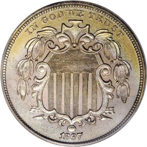 <B>Complete No Rays Shield Nickel Set PR65 PCGS.</B></I> All No Rays dates between 1867 and 1883 are present, including the proof-only 1877 and 1878, and the 1879/8. All coins are certified in matching green label holders that have consecutive serial numbers. The set contains:<BR><B>1867 No Rays PR65 PCGS.</B></I> Lemon, powder-blue, fire-red, and peach toning consume this precisely struck and mark-free Gem.<BR><B>1868 PR65 PCGS.</B></I> Chestnut-gold and olive shades invigorate the sharply struck and nearly unabraded Gem. The second 8 is clearly repunched within its loops.<BR><B>1869 PR65 PCGS.</B></I> A needle-sharp specimen with lovely pastel sky-blue and apricot shades. Carbon is inconsequential, and the satiny surfaces are impressively unperturbed.<BR><B>1870 PR65 PCGS.</B></I> This nicely struck and unblemished proof Gem offers delicate almond-gold and slate patina. Scarcer than suggested by its mintage of 1,000 pieces, since unsold coins were melted.<BR><B>1871 PR65 PCGS.</B></I> Light honey-gold shades enrich this intricately struck and satiny representative. Void of noticeable carbon or contact.<BR><B>1872 PR65 PCGS.</B></I> Fletcher-06. The obverse is prominently die doubled, with the annulet as the pick-up point. This well struck Gem is adorned in lime and gold tints, and has only minor distributed carbon.<BR><B>1873 PR65 PCGS.</B></I> Closed 3, as are all proofs. The 1 in the date is repunched. Sea-green and rose hues embrace the alertly struck and splendidly smooth surfaces.<BR><B>1874 PR65 PCGS.</B></I> The peak of the 4 is repunched. A precisely struck and flashy Gem that exhibits gentle green-gold toning. Scattered minute flyspecks are all that deny a finer grade.<BR><B>1875 PR65 PCGS.</B></I> Lemon and powder-blue compete for territory across this well struck and unabraded Gem. Minuscule carbon flecks are largely confined to the central reverse.<BR><B>1876 PR65 PCGS.</B></I> Beautiful silver-blue and peach patina endows this meticulously struck and impressively preserved Centennial-year Gem.<BR><B>1877 PR65 PCGS.</B></I> Variegated apple-green and gold enrich the impeccably preserved and boldly impressed surfaces. The first (and rarer) of the two proof-only dates in the series.<BR><B>1878 PR65 PCGS.</B></I> Repunching is present with the lower loop of the second 8. Pretty honey-gold fields and devices are framed by glimpses of salmon-pink and sky-blue. A popular proof-only date.<BR><B>1879 PR65 PCGS.</B></I> Pastel sun-gold and cloud-gray shades embrace this pinpoint-sharp Gem. Neither side shows any abrasions, and only minimal carbon is present.<BR><B>1879/8 PR65 PCGS</B></I>. The lovely caramel-gold surfaces are void of hairlines or contact marks, and the few distributed aqua and gray flecks are only apparent beneath a loupe. Proof-only as an overdate.<BR><B>1880 PR65 PCGS.</B></I> Proofs are in demand since Uncirculated 1880 nickels are very rare. A charming green-gold Gem with mark-free surfaces and little carbon. A mint-made retained lamination near 6:30 will be missed by most.<BR><B>1881 PR65 PCGS.</B></I> This well struck specimen displays medium canary-gold patina. The fields are flashy, and flyspecks fail to especially distract.<BR><B>1882 PR65 PCGS.</B></I> An intricately impressed and mark-free Gem that has noticeable cameo contrast, particularly on the obverse. The holder likely pre-dates the Cameo designation for the Liberty nickel series. Freckles of pale gray patina are distributed throughout.<BR><B>1883 PR65 PCGS.</B></I> A razor-sharp Gem with original pale gold toning and only a solitary carbon fleck, which is relegated to the reverse rim at 4:30.<BR><BR><B>Coin Engraver:</B> James B. Longacre<BR><BR><b>Shipping:</b> Coins & Currency (<a target="_blank" href="http://www.heritageauctions.com/common/shipping.php">view shipping information</a>)