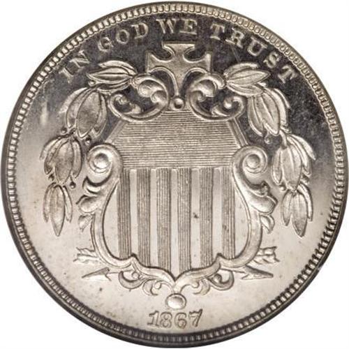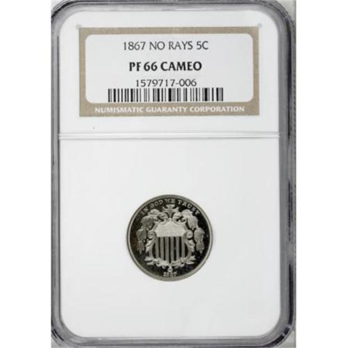 <B>1867 5C No Rays PR66 Cameo NGC.</B></I> The fields show a great depth of mirrored reflectivity and the devices are well-frosted. A single shallow scratch on the shield is noted on the obverse, but its effect is minor. Very delicately toned a light pink. 1867 marked the second year of issue for the Shield nickel, and the design was changed by eliminating the rays on the reverse to facilitate better striking. Census: 10 in 66, 2 finer (11/07).<BR><BR><b>Shipping:</b> Coins & Currency (<a target="_blank" href="http://www.heritageauctions.com/common/shipping.php">view shipping information</a>)