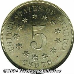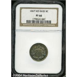 <B>1867<5C> No Rays PR66 NGC.</B></I> Not too many specialists are aware that two subvarieties exist for the 1867 No Rays proof. This piece has the reverse of Judd-507, the 1866 No Rays pattern. A star is centered below the first A in AMERICA; it rests between AM on other No Rays proofs of this date. Several stars and the prominent 5 are recut, as made. This well struck and exemplary premium Gem has lovely bright golden-brown, lilac, and sky-blue colors. Population: 7 in 66, none finer (9/04). <BR><BR><B>Important notice:</B> Heritage usually auctions material at the rate of 200-250 lots per hour. On some occasions eBay Live bid software or the Internet may not be able to keep up with the pace of the auction. We recommend placing a realistic absentee bid now as insurance to avoid disappointment. Occasionally the auctioneer may eliminate or reject an eBay Live bid, and the auctioneer may also reopen a lot after the close of the eBay live bidding (usually because we missed an audience bid), and may reject your bid even if it shows you as the winning bidder. By bidding via eBay Live, you agree that Heritage may award the lot to another bidder at its sole discretion under the circumstances described above or any other reasonable circumstances. Since eBay bids are not shown to us until we open the lot on the floor, we treat those bids just like floor bids. In most cases the floor responds before the eBay bid is presented to us, due to Internet lag time, so for consistency we have made it a policy that floor bids are always considered first over tie eBay live bids. Also please note that all Heritage lots purchased through eBay Live carry a 20% Buyer's Premium. Please make sure you read the Terms and Conditions before you bid.
