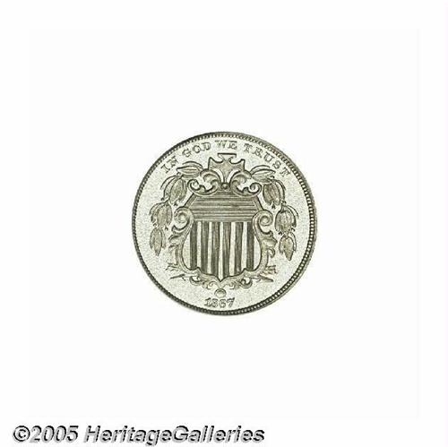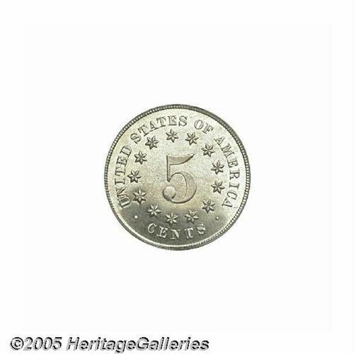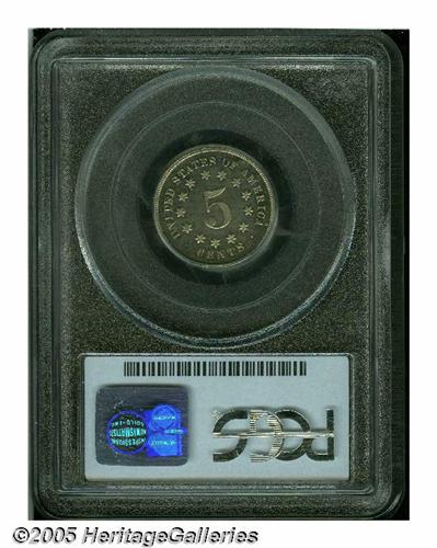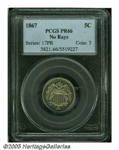 <B>1867<5C> No Rays PR66 PCGS.</B></I> Mostly brilliant with deeper reflective qualities than is most often encountered on this first year of the No Rays type. The watery surfaces are free form noticeable carbon or hairlines. Population: 7 in 66, 0 finer (6/05).