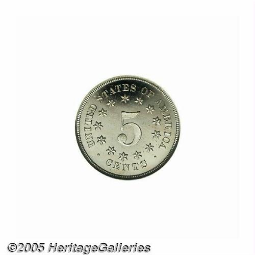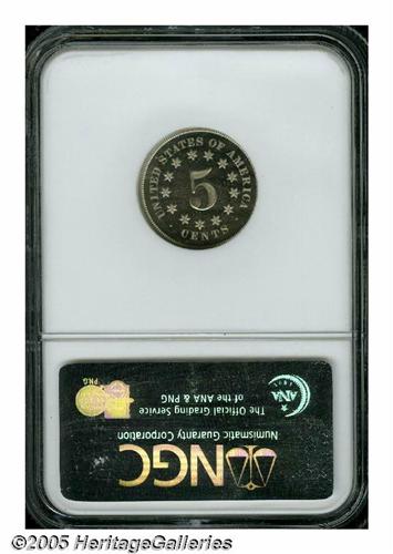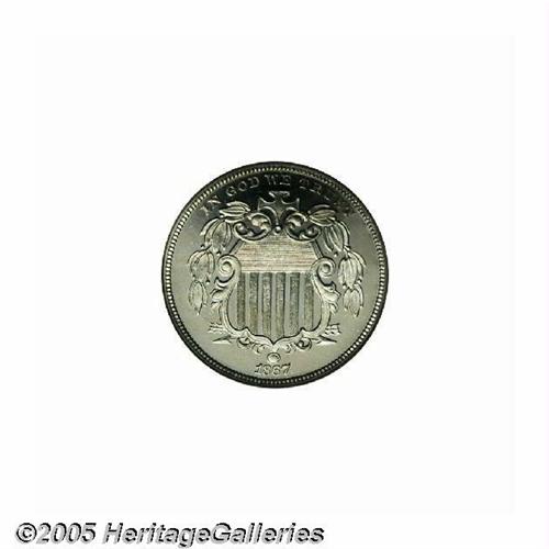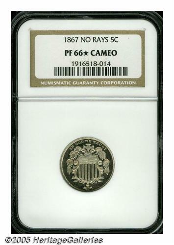 <B>1867<5C> No Rays PR66 <S Cameo NGC.</B></I> A well struck Gem that has particularly attractive cameo contrast on the obverse and reverse. Bright, completely untoned, and essentially unabraded, although the obverse has a couple of miniscule planchet flakes. The 1867 No Rays proof Nickels are an unheralded subtype, since the alignment of stars with the reverse legend differs from that of the business strikes of the same year. Population: 3 in 66 <S, 1 finer with the <S designation (6/05).