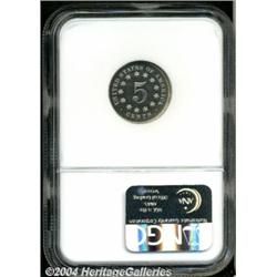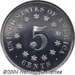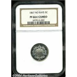 <B>1867<5C> No Rays PR66 <S Cameo NGC.</B></I> The 1867 No Rays is ranked as the third scarcest proof in the Shield Nickel series. It is seldom offered in such a superior state with the average survivor grading no better than PR60-63. This is a magnificent example that is snow-white and sharply contrasted on each side. Exceptional eye appeal even for this lofty grade. <BR><BR><B>Important notice:</B> Heritage usually auctions material at the rate of 200-250 lots per hour. On some occasions eBay Live bid software or the Internet may not be able to keep up with the pace of the auction. We recommend placing a realistic absentee bid now as insurance to avoid disappointment. Occasionally the auctioneer may eliminate or reject an eBay Live bid, and the auctioneer may also reopen a lot after the close of the eBay live bidding (usually because we missed an audience bid), and may reject your bid even if it shows you as the winning bidder. By bidding via eBay Live, you agree that Heritage may award the lot to another bidder at its sole discretion under the circumstances described above or any other reasonable circumstances. Since eBay bids are not shown to us until we open the lot on the floor, we treat those bids just like floor bids. In most cases the floor responds before the eBay bid is presented to us, due to Internet lag time, so for consistency we have made it a policy that floor bids are always considered first over tie eBay live bids. Also please note that all Heritage lots purchased through eBay Live carry a 20% Buyer's Premium. Please make sure you read the Terms and Conditions before you bid. </span></font></tr></table></td></tr></table>