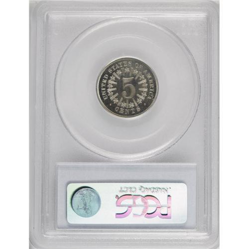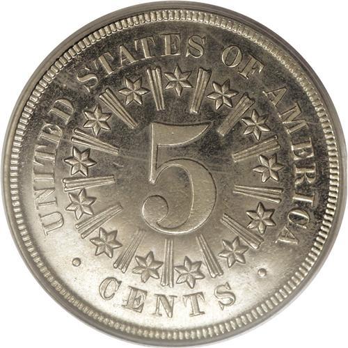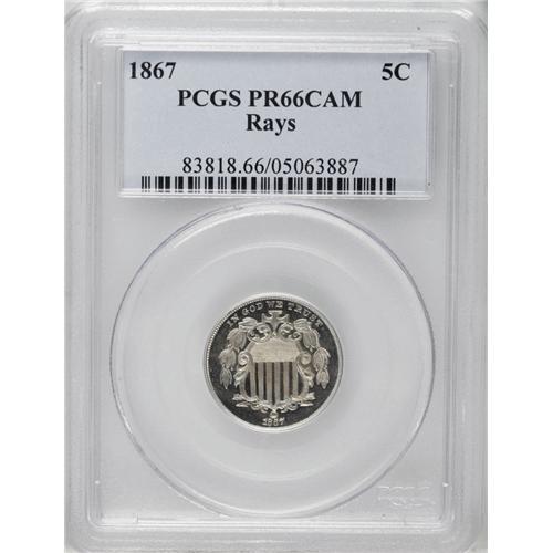 <B>1867<5C> PR66 Cameo PCGS.</B></I> Original. Obverse 1, Die State I; Reverse A, Die State I. While silver half dimes had been minted since 1794 and were worth, of course, five cents, the first copper-nickel coinage above the one cent piece was the three cent nickel, entering circulation in 1865. The Act of May 17, 1866, authorized a new format for the five cent piece. The new Shield, With Rays nickels began circulating in the summer of 1866. Copper-nickel five cent pieces coexisted with silver half dimes until 1873, when half dimes were discontinued. The Shield nickels were the first five cent pieces that contained no precious metal.<BR> The term "nickel" was first given to the newly designed copper-nickel cents, launched in 1856 with the Flying Eagle design, and modified in 1859 with the Indian design. By the time of the Civil War (1861), the small cents were referred to as "nickels" or "nicks." When the three cent nickel was launched, it became a "nickel" in common parlance, and the following year the Shield nickel gave rise to the now-current meaning of " nickel five cent piece."<BR> The decade from 1857 to 1866 was marked by "great change within our small change." The two cent piece was also introduced in 1864, another new design and denomination (although primarily made of copper). In addition, the issuance of three cent postage currency created new urgency to introduce copper-nickel coinage, which most factions favored over paper coinage or fractional currency "shinplasters." In preparation for the launch of the new five cent nickel--an extremely hard and durable metal, difficult to strike up well--Mint personnel developed a great many five cent nickel patterns, many of which featured the obverse bust of George Washington. The fervor for Washingtoniana--funeral medals, Indian Peace medals, presidential and Masonic medals, birth-centennial medals, and other types