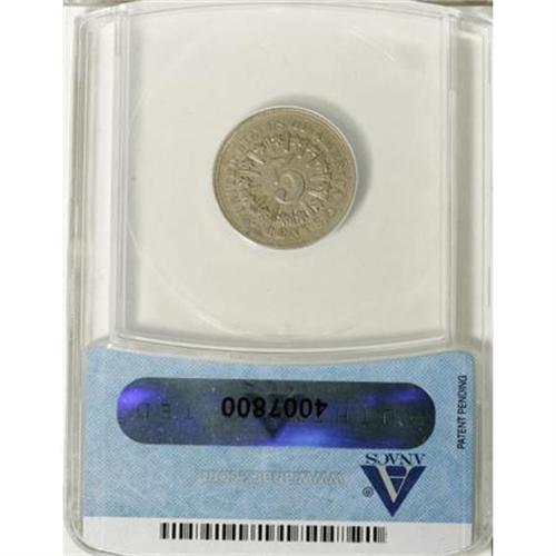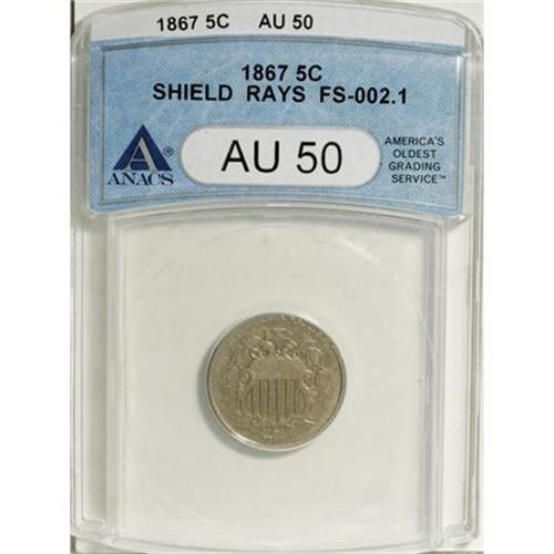 <B>1867 5C Rays AU50 ANACS.</B></I> FS-002.1. NGC Census: (4/395). PCGS Population (8/392). Mintage: 2,019,000. Numismedia Wsl. Price for NGC/PCGS coin in AU50: $192. (#3791)<BR><BR><B>Coin Engraver:</B> James B. Longacre<BR><BR><b>Shipping:</b> Coins & Currency (<a target="_blank" href="http://www.heritageauctions.com/common/shipping.php">view shipping information</a>)