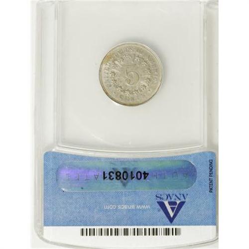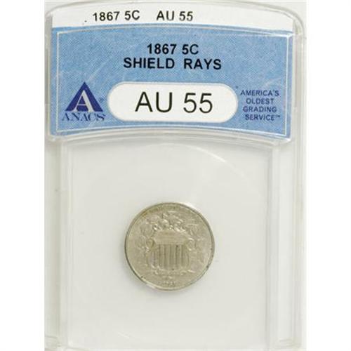 <B>1867 5C Rays AU55 ANACS.</B></I> NGC Census: (21/370). PCGS Population (24/361). Mintage: 2,019,000. Numismedia Wsl. Price for NGC/PCGS coin in AU55: $208. (#3791)<BR><BR><B>Coin Engraver:</B> James B. Longacre<BR><BR><b>Shipping:</b> Coins & Currency (<a target="_blank" href="http://www.heritageauctions.com/common/shipping.php">view shipping information</a>)