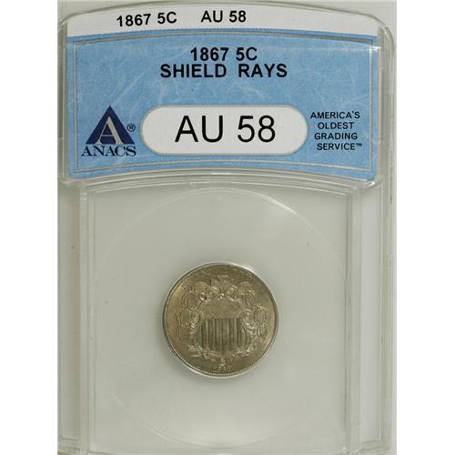 <B>1867 5C Rays AU58 ANACS.</B></I> NGC Census: (32/334). PCGS Population (40/317). Mintage: 2,019,000. Numismedia Wsl. Price: $221. (#3791)<BR><BR><b>Shipping:</b> Coins & Currency (<a target="_blank" href="http://www.heritageauctions.com/common/shipping.php">view shipping information</a>)
