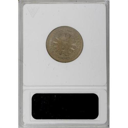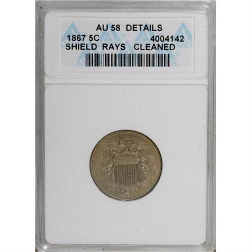 <B>1867 5C Rays--Cleaned--ANACS. AU58 Details.</B></I> NGC Census: (32/338). PCGS Population (41/320). Mintage: 2,019,000. Numismedia Wsl. Price for NGC/PCGS coin in AU58: $221. (#3791)<BR><BR><B>Coin Engraver:</B> James B. Longacre<BR><BR><b>Shipping:</b> Coins & Currency (<a target="_blank" href="http://www.heritageauctions.com/common/shipping.php">view shipping information</a>)
