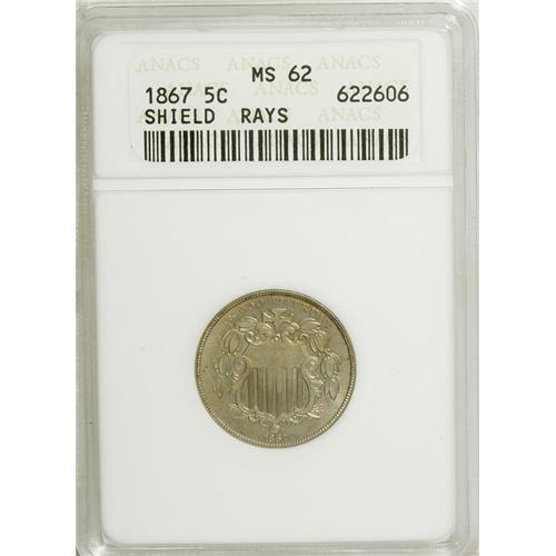 <B>1867 5C Rays MS62 ANACS.</B></I> NGC Census: (38/285). PCGS Population (44/261). Mintage: 2,019,000. Numismedia Wsl. Price: $400. (#3791)<BR><BR><b>Shipping:</b> Coins & Currency (<a target="_blank" href="http://www.heritageauctions.com/common/shipping.php">view shipping information</a>)