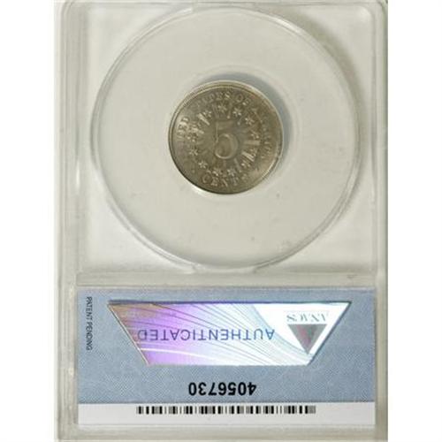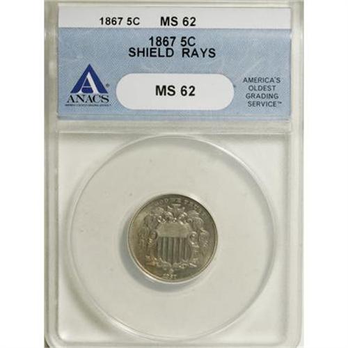 <B>1867 5C Rays MS62 ANACS.</B></I> . NGC Census: (40/290). PCGS Population (45/263). Mintage: 2,019,000. Numismedia Wsl. Price for NGC/PCGS coin in MS62: $440. (#3791)<BR><BR><B>Coin Engraver:</B> James B. Longacre<BR><BR><b>Shipping:</b> Coins & Currency (<a target="_blank" href="http://www.heritageauctions.com/common/shipping.php">view shipping information</a>)