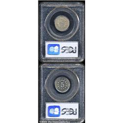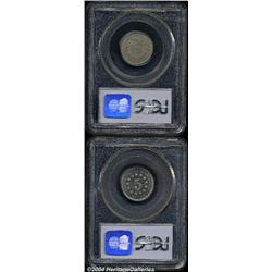 <B>1867<5C> Rays MS62 PCGS,</B></I> adequately struck, with light gray toning over somewhat subdued surfaces; and an<B>1879 PR64 Cameo PCGS,</B></I> very nice cameo contrast, with just a touch of speckled faint olive-gray color, well struck, and virtually abrasions free. 2 Coins <BR><BR><B>Important notice:</B> Heritage usually auctions material at the rate of 200-250 lots per hour. On some occasions eBay Live bid software or the Internet may not be able to keep up with the pace of the auction. We recommend placing a realistic absentee bid now as insurance to avoid disappointment. Occasionally the auctioneer may eliminate or reject an eBay Live bid, and the auctioneer may also reopen a lot after the close of the eBay live bidding (usually because we missed an audience bid), and may reject your bid even if it shows you as the winning bidder. By bidding via eBay Live, you agree that Heritage may award the lot to another bidder at its sole discretion under the circumstances described above or any other reasonable circumstances. Since eBay bids are not shown to us until we open the lot on the floor, we treat those bids just like floor bids. In most cases the floor responds before the eBay bid is presented to us, due to Internet lag time, so for consistency we have made it a policy that floor bids are always considered first over tie eBay live bids. Also please note that all Heritage lots purchased through eBay Live carry a 20% Buyer's Premium. Please make sure you read the Terms and Conditions before you bid.