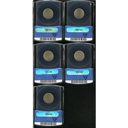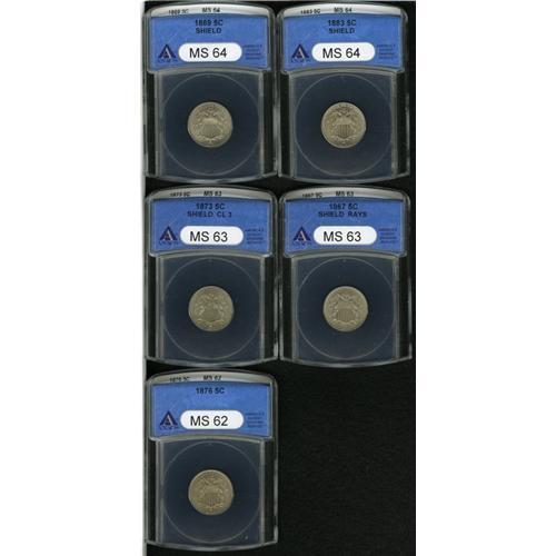 <B>1867<5C> Rays MS63 ANACS,</B></I> satiny, bold, light tan-gray toning; <B>1869 MS64 ANACS,</B></I> sharply struck, a few toning flecks; <B>1873 Closed 3 MS63 ANACS,</B></I> lustrous, unmarked, minor carbon; <B>1876 MS62 ANACS,</B></I> boldly impressed and attractive for the grade; and an <B>1883 MS64 ANACS,</B></I> well struck, prominent die cracks, impressive luster.