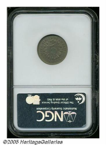 <B>1867<5C> Rays MS64 NGC.</B></I> This near-Gem has light green-gray surfaces with soft luster. The design features reveal adequate definition, except that portions of the horizontal and vertical shield stripes are soft. Multiple die cracks (as struck) are evident near the obverse peripheries.