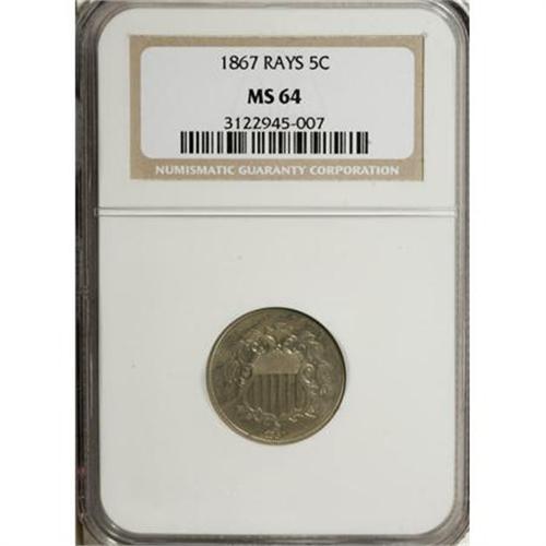 <B>1867 5C Rays MS64 NGC.</B></I> NGC Census: (165/60). PCGS Population (128/28). Mintage: 2,019,000. Numismedia Wsl. Price for NGC/PCGS coin in MS64: $865. (#3791)<BR><BR><B>Coin Engraver:</B> James B. Longacre<BR><BR><b>Shipping:</b> Coins & Currency (<a target="_blank" href="http://www.heritageauctions.com/common/shipping.php">view shipping information</a>)