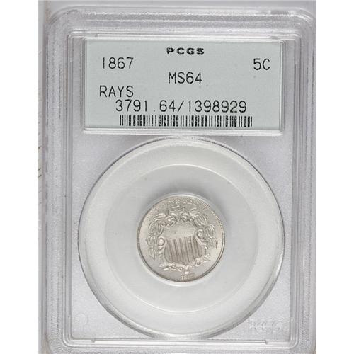 <B>1867 5C Rays MS64 PCGS.</B></I> Light chestnut toning graces this lustrous and unmarked near-Gem. The centers are softly defined, all that precludes a finer grade. Housed in an old green label holder.<BR><BR><b>Shipping:</b> Coin/Currency (<a target="_blank" href="http://www.heritageauctions.com/common/shipping.php">view shipping information</a>)