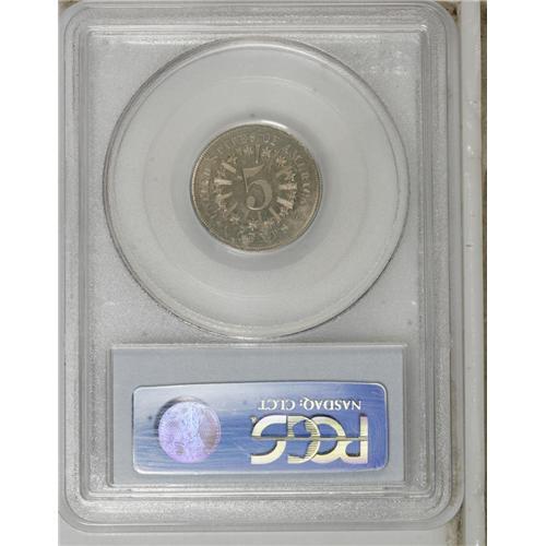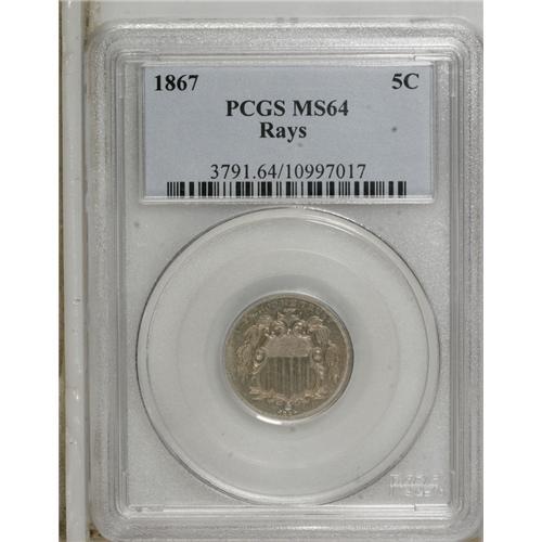 <B>1867 5C Rays MS64 PCGS.</B></I> Rose, blue, and beige pastels run over lustrous surfaces that are minimally abraded. The design features are sharply impressed throughout. Excess plastic distorts the appearance of the obverse dentilation.<BR><BR><b>Shipping:</b> Coins & Currency (<a target="_blank" href="http://www.heritageauctions.com/common/shipping.php">view shipping information</a>)