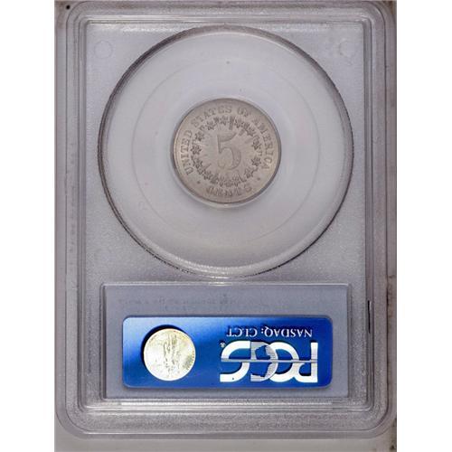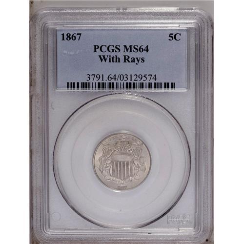 <B>1867<5C> Rays MS64 PCGS.</B></I> Silver-gray with some typical flatness of strike on the central highpoints and the often-seen die breaks about the shield on the obverse and portions of the legend on the reverse. Population: 119 in 64, 29 finer (1/06).