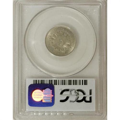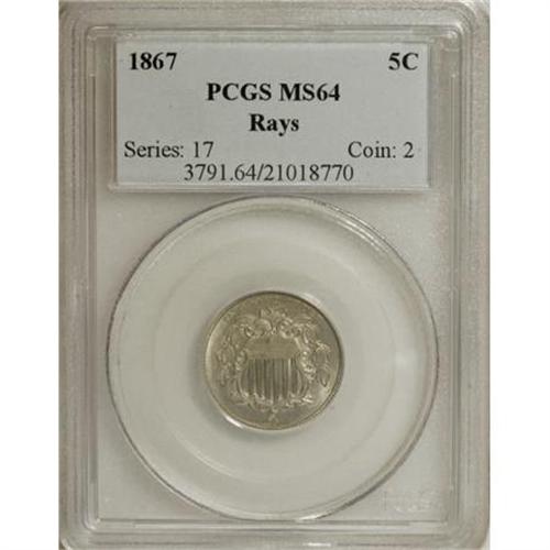 <B>1867 5C Rays MS64 PCGS.</B></I> The more challenging of the two With Rays issues, the 1867 has a mintage of just over 2 million pieces, and few such coins were saved at the time of issue. Pastel blue and nickel-gray patina graces the lustrous surfaces of this Choice example. Both the obverse and reverse margins show evidence of die buckling. PCGS has graded only 18 pieces finer (8/07).<BR><BR><B>Coin Engraver:</B> James B. Longacre<BR><BR><b>Shipping:</b> Coins & Currency (<a target="_blank" href="http://www.heritageauctions.com/common/shipping.php">view shipping information</a>)