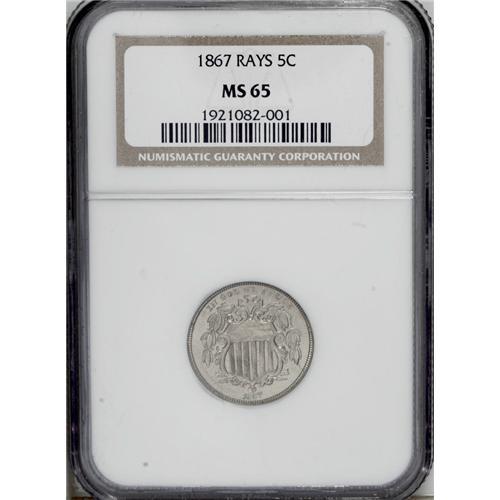 1867 5C Rays MS65 NGC. A low mintage of 2,019,000 piec