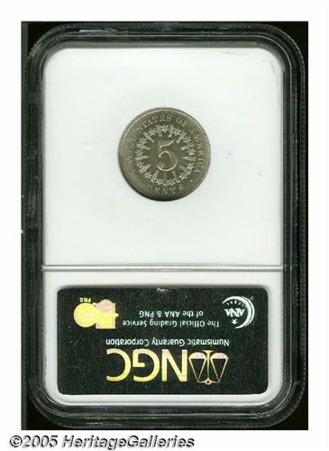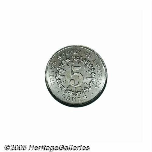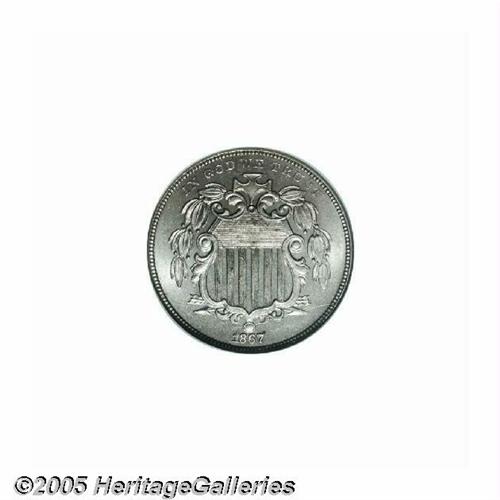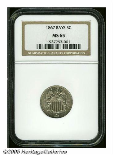 <B>1867<5C> Rays MS65 NGC.</B></I> Not only is this radiant Gem endowed with bountiful luster, but the strike is also exactly executed in all areas. An angling die crack begins (or ends, depending on your perspective) near the ball of the shield and extends to the border near 4 o'clock. Despite a mintage of over 2 millions pieces, widespread circulation and die stress on those that were saved have left MS65 and better pieces in short supply. Population: 44 in 65, 8 finer (6/05).