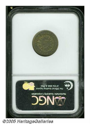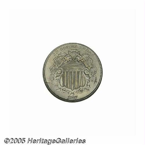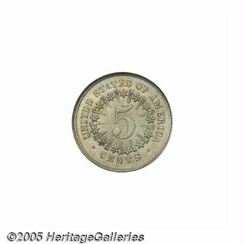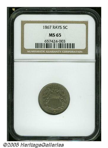 <B>1867<5C> Rays MS65 NGC.</B></I> Warm golden-gray patina displays wisps of tan, rose, and sky-blue patina over softly lustrous surfaces, and the design elements are sharply struck throughout. Only a few of the horizontal lines in the shield reveal a hint of softness. The only apparent contact mark is trivial, and is located to the right of the denomination 5. A couple of fine die cracks are noted on the obverse. Population: 44 in 65, 8 finer (6/05).