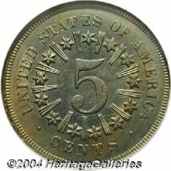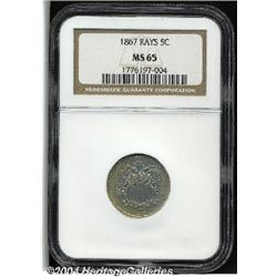 <B>1867<5C> Rays MS65 NGC.</B></I> Despite a significantly lower mintage than the first-year 1866, the 1867 Rays (2 million pieces produced) is not a rare coin in an absolute sense. On the other hand, many examples are plagued by inadequate striking quality and/or poor planchet stock with the result that the quality-conscious buyer will experience quite a bit of difficulty with this issue. Fortunately, we are able to offer a PCGS-certified Gem in this sale. The strike may not be complete, but it is well above average for the type with only a few isolated areas of bluntness toward the central obverse and over the lower reverse stars. Myriad peripheral die cracks are noted on the obverse. Both sides are lightly toned with antique-golden and reddish-tan hues. Desirable and most attractive. Population: 42 in 65, 7 finer (9/04). <BR><BR><B>Important notice:</B> Heritage usually auctions material at the rate of 200-250 lots per hour. On some occasions eBay Live bid software or the Internet may not be able to keep up with the pace of the auction. We recommend placing a realistic absentee bid now as insurance to avoid disappointment. Occasionally the auctioneer may eliminate or reject an eBay Live bid, and the auctioneer may also reopen a lot after the close of the eBay live bidding (usually because we missed an audience bid), and may reject your bid even if it shows you as the winning bidder. By bidding via eBay Live, you agree that Heritage may award the lot to another bidder at its sole discretion under the circumstances described above or any other reasonable circumstances. Since eBay bids are not shown to us until we open the lot on the floor, we treat those bids just like floor bids. In most cases the floor responds before the eBay bid is presented to us, due to Internet lag time, so for consistency we have made it a policy that floor bids are always considered first over tie eBay live bids. Also please note that all Heritage lots purchased through eBay Live carry a 20% Buyer's Premium. Please make sure you read the Terms and Conditions before you bid.