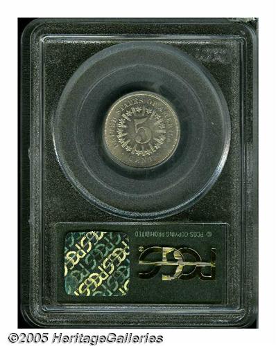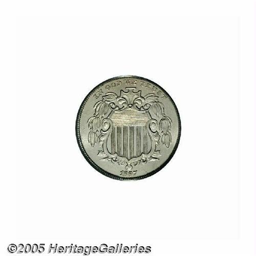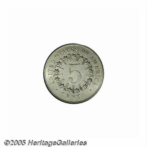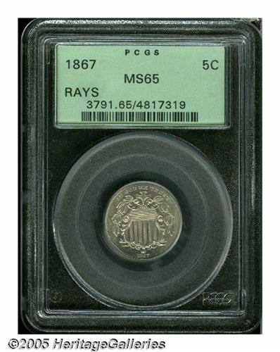 <B>1867<5C> Rays MS65 PCGS.</B></I> Despite a significantly lower mintage than the first-year 1866, the 1867 Rays (2 million pieces produced) is not a rare coin in an absolute sense. On the other hand, many examples are plagued by inadequate striking quality and/or poor planchet stock with the result that the quality-conscious buyer will experience quite a bit of difficulty with this issue. Fortunately, we are able to offer a PCGS-certified Gem in this ANA sale. The strike may not be complete, but it is well above average for the type with even full centrils visible on the reverse stars. A couple of curving die cracks are noted near the date on the obverse. Both sides are untoned with no singularly mentionable marks. Population: 24 in 65, 4 finer (6/05).
