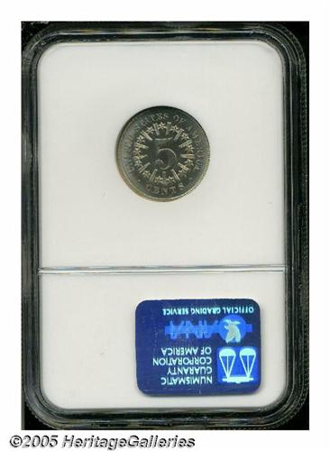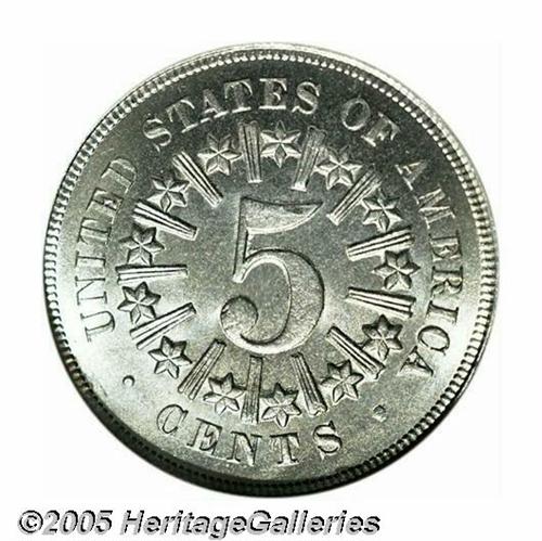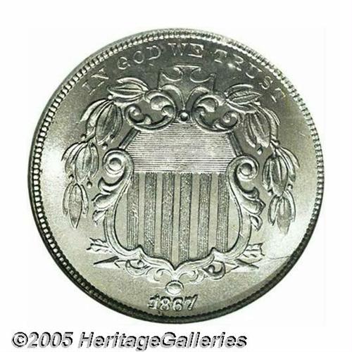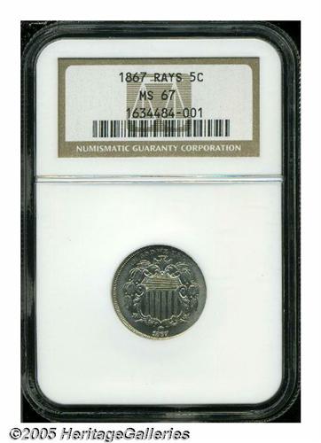 <B>1867<5C> Rays MS67 NGC.</B></I> An old fable among numismatists regarding the Shield Nickel is that the reverse rays were dropped after less than two years of production because of an outcry in the North about the supposed link between James Barton Longacre's design and the "Stars and Bars" of the recently defunct Southern Confederacy. Although it makes a good story, this theory is almost certainly not correct. More likely, the Mint removed the rays from the reverse of the Shield Nickel in 1867 in order to make the new denomination easier to produce. Since only 2 million Rays Shield Nickels were produced in 1867 (as opposed to 28.8 million coins without rays), it is little wonder that this second-year variety is difficult to locate in the finer Mint State grades. This uncommonly bold, Superb Gem is easily among the finest we have ever seen of the issue and NGC concurs, this being the only MS67 certified to date (04/05). The surfaces are particularly lustrous and only a horizontal die crack above and to the right of the date provides an indication of the tremendous die stress generated by this more complicated design. Population: 1 in 67, 0 finer (4/05).<BR><I>From The Western Hills Collection.</B></I>