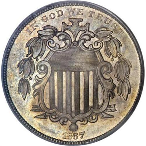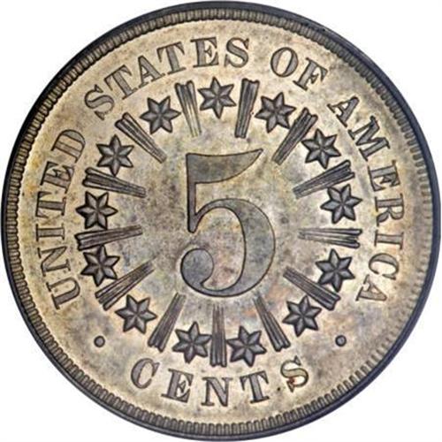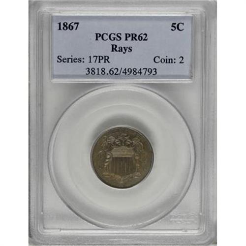 <B>1867 5C Rays PR62 PCGS.</B></I> Examination of this coin shows that the diagnostics of this piece are not consistent with the original strikings from February 8, 1867. This piece appears to have been struck from a second die pairing and may have been struck as late as 1869. In spite of the generally accepted mintage for this issue of 25 proofs, more than that number are extant and today it is believed that at least 50 coins were struck of this issue judging from the numbers certified by the major services. <BR> This piece shows dusky gray-lilac toning over both sides. The fields are subdued on the obverse but show noticeable reflectivity on the reverse. Fully struck, as one would expect from a proof striking. Population: 2 in 62, 37 finer (12/07).<BR><BR><B>Coin Engraver:</B> James B. Longacre<BR><BR><b>Shipping:</b> Coins & Currency (<a target="_blank" href="http://www.heritageauctions.com/common/shipping.php">view shipping information</a>)