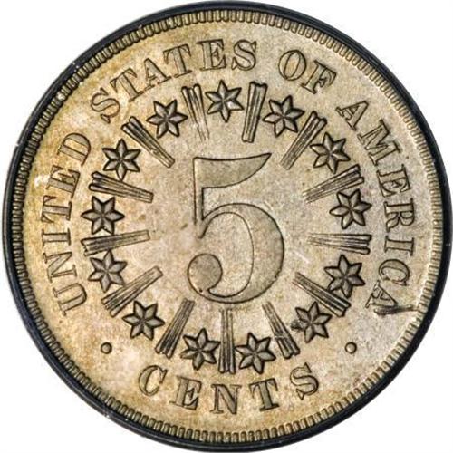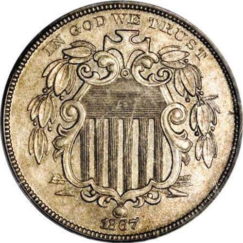 <B>1867 5C Rays PR62 PCGS.</B></I> The 1867 With Rays nickel in proof format is a classic rarity, with probably no more than several dozen or so known. The mintage is unknown, though David Bowers in his Shield and Liberty Head nickel reference estimates it to be 55 to 80 pieces. Bowers' estimates are based, in least in part, on the research of John Dannreuther, who Bowers says: "... has studied the die technicalities, has demonstrated that Proofs were struck on several runs. Per the same authority, an estimated 15 originals were made in 1867, plus perhaps three or more times that many were made on at least five later production sequences."<BR> Uniform golden-gray patina bathes both sides of this PR62 specimen, obscuring its reflectivity. An attentive impression, befitting a proof strike, emboldens all of the design elements. A reverse mark at 4:30 limits the grade.<BR><BR><B>Coin Engraver:</B> James B. Longacre<BR><BR><b>Shipping:</b> Coins & Currency (<a target="_blank" href="http://www.heritageauctions.com/common/shipping.php">view shipping information</a>)