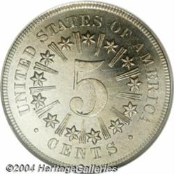 <table><tr><td><table><tr><td>1867 5C Rays PR64 NGC. Obverse 1, State I. Reverse A, State I. This is an original striking, believed struck on February 8, 1867. This is the third example we have sold of this rare original proof since November. The research on these pieces was done over many years by John Dannreuther and only recently published. And as one would expect from anything researched by J.D. it is air-tight. It is also rather dense reading, but if one follows his line of thought the light will click on after several pages. To briefly summarize, both With Rays and No Rays proofs from 1867 shared a common obverse. Restrikes of the With Rays coins were obviously made in later years (most likely under the supervision of Mint Director Henry Linderman). The most obvious die characteristics of Obverse 1, State 1 coins are: 1) the left base of the 1 is over the right part of a denticle, the 7 is recut; 2) a long, curly die line runs from the 10th horizontal stripe down through the left side of the shield and ends in the circle; 3) there is a strong inner left bar to the W in WE; 4) the inner right berries are recut with a tiny polish line from the lower berry to the adjacent leaf. Other diagnostics are present also, but the ones listed above are by far the most obvious ones that distinguish Originals from Restrikes. This is an exceptionally nice coin for the grade with excellent reflectivity in the fields (for a Shield nickel) and a light overlay of gray patina. There are no singularly distracting contact marks on either side, just a few light ones that are evident with magnification and a few minor flecks of carbon, which account for the grade. Prices for the two original strikings we have offered for sale at public auction have been uniformly strong, and we expect a similar result for this piece. The ANACS PR60 we sold in our November New York Sale brought a surprising $17,250, and the NGC PR66 Cameo in our January Long Beach Auction realized a record-shattering $132,250! Obviously, advanced collectors are willing to pay significant premiums for this rare die state--a coin that was provably struck in 1867. <BR><BR><B>Important notice:</B> Heritage usually auctions material at the rate of 200-250 lots per hour. On some occasions eBay Live bid software or the Internet may not be able to keep up with the pace of the auction. We recommend placing a realistic absentee bid now as insurance to avoid disappointment. Occasionally the auctioneer may eliminate or reject an eBay Live bid, and the auctioneer may also reopen a lot after the close of the eBay live bidding (usually because we missed an audience bid), and may reject your bid even if it shows you as the winning bidder. By bidding via eBay Live, you agree that Heritage may award the lot to another bidder at its sole discretion under the circumstances described above or any other reasonable circumstances. Since eBay bids are not shown to us until we open the lot on the floor, we treat those bids just like floor bids. In most cases the floor responds before the eBay bid is presented to us, due to Internet lag time, so for consistency we have made it a policy that floor bids are always considered first over tie eBay live bids. Also please note that all Heritage lots purchased through eBay Live carry a 20% Buyer's Premium. Please make sure you read the Terms and Conditions before you bid. <BR><BR><B>IMPORTANT ANNOUNCEMENT ABOUT RESERVES:</B> Heritage now divulges all reserves on its web site 7 days before every auction. If you want to know whether the reserve on this lot has been met, and if not, what the reserve amount is, please visit this lot page on the HeritageCoin.com web site, or email: bid@HeritageGalleries.com </span></font></td></tr></table></td></tr></table>