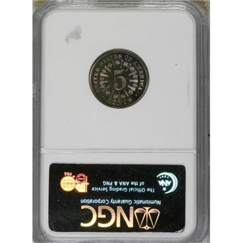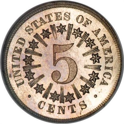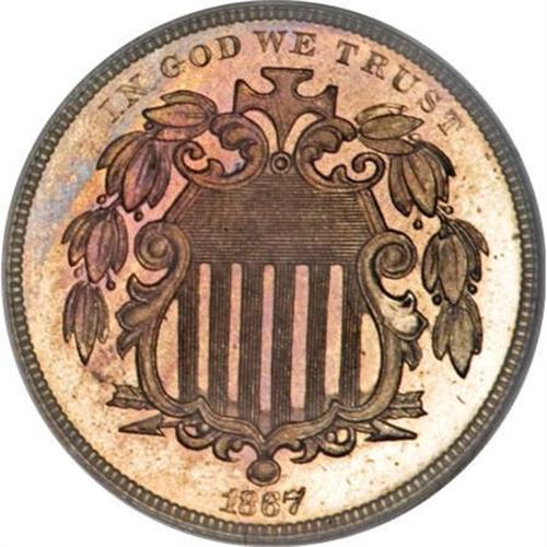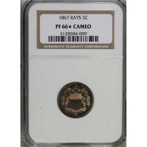 <B>1867 5C Rays PR66 <img src="/images/star.gif" width="10" height="10" alt="" border="0"> Cameo NGC.</B></I> Dannreuther-2. The left base of the 1 in the date is over the left portion of a dentil. The lower portion of the shield displays die polish. The lower shield is clear for Dannreuther-1, and Dannreuther-3 has the left base of the 1 over the right portion of a dentil. The rarity of the proof 1867 Rays nickel was known to collectors at an early date, and it appears that the Mint made unofficial restrikes between 1867 and 1879, likely for sale at a profit to well-connected Philadelphia dealers.<BR> The 1867 Rays nickel has a traditional proof mintage of 25 pieces, which presumably applies only to examples struck in early 1867. In the <I>2006 Guide Book of Shield and Liberty Head Nickels</B></I>, Q. David Bowers estimates a mintage of 55 to 80 proofs. This figure is approximately 10% of the 1867 No Rays mintage, and less than 2% of the proof production for the 1883 Shield nickel. The key date status of the proof 1867 Rays variety is unchallenged.<BR> Delicate plum-red, gold, and ice-blue toning visits this flashy and intricately struck Premium Gem. The attractive patina is undoubtedly the inspiration for the Star designation awarded by NGC. For those who research the pedigrees of this rare variety, we note a small planchet flake beneath the E in CENTS, and a curly mint-made lint mark at the lower right corner of the N in IN.<BR> NGC has certified 22 proof 1867 Rays nickels in all grades, some of which may represent duplicate submissions. None have been certified as Ultra Cameo, and none have been certified without a Cameo designation above the PR65 level. Three proofs are graded PR66 Cameo, but only the present specimen has garnered the Star designation. Thus, as of (3/08), it holds the honor of finest NGC-certified. The PCGS population is similar, with none encapsulated as Deep Cameo and none certified higher than PR66 with or without a Cameo designation.<BR><BR><b>Shipping:</b> Coins & Currency (<a target="_blank" href="http://www.heritageauctions.com/common/shipping.php">view shipping information</a>)