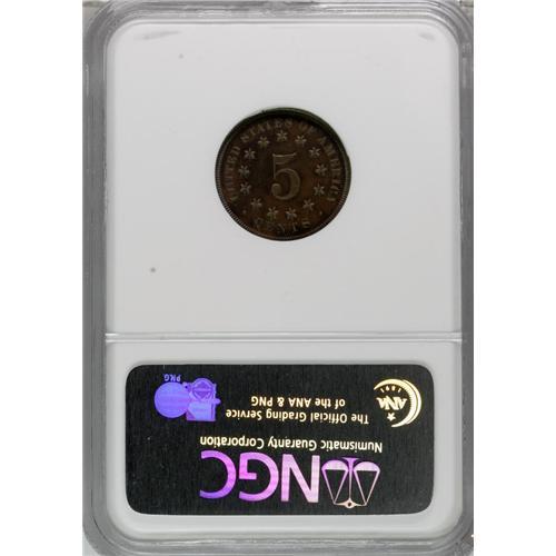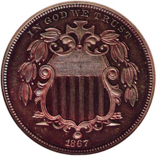 <B>1867 5C Shield Five Cents, Judd-573, Pollock-649, 650, Low R.6, PR65 Red and Brown NGC.</B></I> Pollock Reverse B. This pattern is from the regular No Rays Shield nickel dies, but struck in copper with a plain edge. There are two reverse varieties. On the Pollock Reverse B--used for the proof 1867 Shield nickels, according to the Judd ninth edition--stars point to the left foot of the A and the right edge of the E in STATES, and in CENTS to the center of the E and the center of the T. This piece displays beautiful deep yellow, magenta, and olive-brown hues on each side, with brilliant luster underneath, with a premium appearance.<BR><BR><b>Shipping:</b> Coins & Currency (<a target="_blank" href="http://www.heritageauctions.com/common/shipping.php">view shipping information</a>)