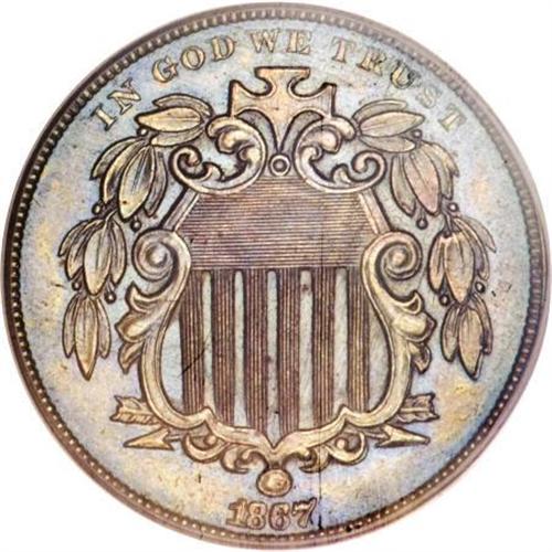 <B>1867 5C Shield Five Cents, Judd-573, Pollock-650, Low R.6, PR63 Brown PCGS.</B></I> Similar to the regular issue 1867 No Rays nickel, but struck in copper (instead of copper-nickel) with a plain edge. Judd-573 has two variants, which slightly differ in the arrangement of the stars on the reverse. Pollock-650 has a star centered between the AM in AMERICA, unlike Pollock-649 which features the star beneath the first A in AMERICA. Sharply defined throughout, the surfaces show an intermingling of deep brown and blue patina. <BR><BR><b>Shipping:</b> Coins & Currency (<a target="_blank" href="http://www.heritageauctions.com/common/shipping.php">view shipping information</a>)