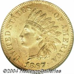 <table><tr><td><TABLE cellSpacing=0 cellPadding=0 width="100%" bgColor=#000000 border=0><TBODY> <TR><TD width="100%"><TABLE cellSpacing=1 cellPadding=3 width="100%" border=0><TBODY><TR><TD width="100%" bgColor=#79735c><FONT face=arial color=#ffffff size=3><B>Description</B> </FONT></TD></TR><TR><TD width="100%" bgColor=#ffffff><FONT face=arial size=2><B>1867/67 1C MS64 Red PCGS.</B></I> Snow-1, FS-008. The 67 in the date is widely repunched at the peak of the digits. Satiny luster rolls across the bright honey-gold surfaces. Well struck and seemingly free from contact, although the borders have a couple of tiny gray spots. Boldly die clashed (as made) along the Indian's profile and the lower inner wreath. As of (2/04), PCGS has only certified two examples as Red, both of which grade MS64. </FONT></TD></TR></TBODY></TABLE></TD></TR></TBODY></TABLE><BR><A name=PricesRealized></A><TABLE cellSpacing=0 cellPadding=0 width="100%" bgColor=#000000 border=0><TBODY><TR><TD width="100%"><TABLE cellSpacing=1 cellPadding=3 width="100%" border=0><TBODY><TR><TD width="100%" bgColor=#79735c><A name=PR><FONT face=arial color=#ffffff size=3><B>Previous Prices from Heritage Auctions</B> </FONT></A></TD></TR><TR><TD bgColor=#f6f6ed>No Prior Data Recorded </TD></TR><TR><TD bgColor=#ffffff><FONT face=arial size=1 ?>PLEASE NOTE: All prices realized reflect the final hammer price PLUS the buyer's premium in auctions that charge a buyer's premium. Each item has a notation at the top of the listing indicating whether that lot included a buyer's premium. Example: A item that sells with a final hammer price of $100 and a 20% buyer's premium will display with a price realized of $120. All information listed is intended to be as accurate as possible, but errors are possible. Please use this guide carefully and inform us of any inaccuracies. </FONT></TD></TR></TBODY></TABLE></TD></TR></TBODY></TABLE><BR><TABLE cellSpacing=0 cellPadding=0 width="100%" bgColor=#000000 border=0><TBODY><TR><TD width="100%"><TABLE cellSpacing=1 cellPadding=3 width="100%" border=0><TBODY><TR><TD width="100%" bgColor=#79735c colSpan=6><FONT face=arial color=#ffffff size=3><B>Price Guide*</B> </FONT></TD></TR><TR bgColor=#f6f6ed><TD align=middle><B>Grade</B> </TD><TD align=middle><B>Coin World<BR>(Trends)</B> </TD><TD align=middle><B>Numismedia<BR>Retail</B> </TD><TD align=middle><B>Numismedia<BR>Wholesale</B> </TD><TD align=middle><B>Coin<BR>Universe</B> </TD><TD align=middle><B>Heritage<BR>Value Index</B> </TD></TR><TR bgColor=#ffffff><TD align=middle>63</TD><TD align=right>---</TD><TD align=right>---</TD><TD align=right>---</TD><TD align=right>---</TD><TD align=right>$51.30</TD></TR><TR style="FONT-WEIGHT: bold" bgColor=#cccfdd><TD align=middle>64</TD><TD align=right>---</TD><TD align=right>---</TD><TD align=right>---</TD><TD align=right>---</TD><TD align=right>$135.00</TD></TR><TR bgColor=#ffffff><TD align=middle>65</TD><TD align=right>---</TD><TD align=right>---</TD><TD align=right>---</TD><TD align=right>---</TD><TD align=right>$387.00</TD></TR><TR bgColor=#ffffff><TD colSpan=6><FONT size=1>*All information listed is intended to be as accurate as possible, but errors are possible. No item may be returned or refused based on this information which is provided as a service to our customers. You should contact each pricing source directly to determine the accuracy of this information. </FONT></TD></TR></TBODY></TABLE></TD></TR></TBODY></TABLE><BR><TABLE cellSpacing=0 cellPadding=0 width="100%" bgColor=#000000 border=0><TBODY><TR><TD width="100%"><TABLE cellSpacing=1 cellPadding=3 width="100%" border=0><TBODY><TR><TD width="100%" bgColor=#79735c><FONT face=arial color=#ffffff size=3><B>Population Guide</B> </FONT></TD></TR><TR bgColor=#ffffff><TD align=middle><!-- Begin Output of Population Grid--><TABLE cellSpacing=0 cellPadding=0 width="100%" border=0><TBODY><TR><TD vAlign=center><TABLE cellSpacing=0 width="100%" border=1 cellsadding="3"><TBODY><TR><TD vAlign=center><TABLE cellSpacing=0 cellPadding=3 width="100%" border=1><TBODY><TR><TD vAlign=center align=middle bgColor=#f0f1e8 colSpan=2 <CENTER><FONT face=Arial size=2><B>PCGS Pop </B></FONT><CENTER></CENTER></TD><TD vAlign=center align=middle bgColor=#f0f1e8 colSpan=2><CENTER><FONT face=Arial size=2><B>NGC Pop</B></CENTER></FONT></TD></TR><TR><TD vAlign=center><FONT face=Arial size=2>(64)</FONT> </TD><TD vAlign=center align=right><FONT face=Arial size=2>2</FONT> </TD><TD vAlign=center><FONT face=Arial size=2>(64)</FONT> </TD><TD vAlign=center align=right><FONT face=Arial size=2>0</FONT> </TD></TR><TR><TD vAlign=center><FONT face=Arial size=2>(>64)</FONT> </TD><TD vAlign=center align=right><FONT face=Arial size=2>0</FONT> </TD><TD vAlign=center><FONT face=Arial size=2>(>64)</FONT> </TD><TD vAlign=center align=right><FONT face=Arial size=2>0</FONT> </TD></TR></TBODY></TABLE></TD></TR></TBODY></TABLE></TD></TR></TBODY></TABLE><!-- End Output of Population Grid--></TD></TR></TBODY></TABLE></TD></TR></TBODY></TABLE><BR><TABLE cellSpacing=0 cellPadding=0 width="100%" bgColor=#000000 border=0><TBODY><TR> <font color='#000000'><span style='background-color: #FFFFFF'><td bgcolor='#FFFFFE'> Important notice: Heritage usually auctions material at the rate of 200-250 lots per hour. On some occasions eBay Live bid software or the Internet may not be able to keep up with the pace of the auction. We recommend placing a realistic absentee bid now as insurance to avoid disappointment. Occasionally the auctioneer may eliminate or reject an eBay Live bid, and the auctioneer may also reopen a lot after the close of the eBay live bidding (usually because we missed an audience bid), and may reject your bid even if it shows you as the winning bidder. By bidding via eBay Live, you agree that Heritage may award the lot to another bidder at its sole discretion under the circumstances described above or any other reasonable circumstances. Since eBay bids are not shown to us until we open the lot on the floor, we 