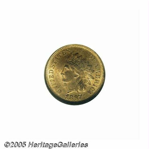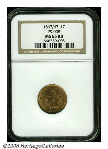 <B>1867/67<1C> MS65 Red NGC.</B></I> FS-008, Snow-1b. The 67 in the date is widely repunched north. The raised die mark on the E in CENT identifies the 'b' reverse. Originally believed to be a Large 67 over Small 67 variety, but according to Rick Snow, Larry Steve and others determined that "the initial punching was squeezed to appear smaller by the second, stronger impression." A crisply struck and lustrous brick-red Gem, pleasing despite a small spot beneath the jaw. NGC Population: 2 in 65 Red, none finer (6/05).