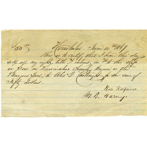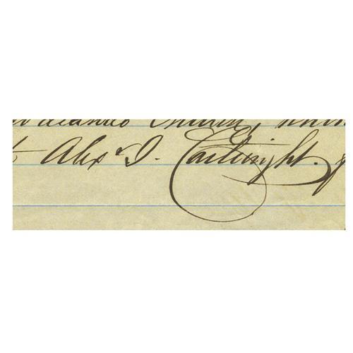 <B>1867 Alexander Cartwright Handwritten Signed Land Purchase Document.</B></I> Considered by many to be the father of modern baseball, it was Cartwright who organized the sport's first official game, played June 19, 1846 at Elysian Field in Hoboken, New Jersey. Cartwright was the umpire, and fined one player six cents for cursing. He headed west for the California gold streams in 1849 but became sickened with dysentery and left California for Hawaii, where he lived out the rest of his days. Here we find a legal document penned entirely in Cartwright's hand at "Honolulu, June 10, 1867" that finalizes the sale of a property to the Hall of Fame pioneer. He references himself in the text, supplying a magnificent "Alex J. Cartwright" autograph. All ink remains in terrific 10/10 condition, and the lined page shows some light wear and toning along the upper edge, neither of which affects the all-important signature. No serious baseball autograph should fail to include a signature from this seminal figure. <I>LOA from PSA/DNA.</B></I>
