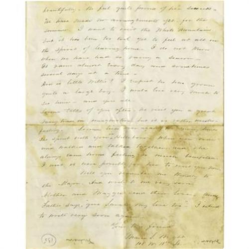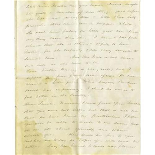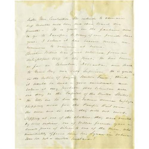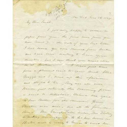 <B>1867 Autograph Letter With Travel and American Indian Content.</B></I> Four pages, 6.5” x 8”, New York, June 26, 1867, in ink. The subject matter of this letter would lead one to believe that the writer, one Maria S. Wright, is well educated and affluent. The spelling is impeccable and the content speaks to subjects of wealth. Maria writes: “<I>It is quite in the fashion now to go to Europe. So many of our friends have gone. I believe it has become more uncommon to remain at home.</B></I>” She speaks of a brother who “<I>is quite in the notion of buying western land - thinks it would be such a good investment and believes it probable that Columbus </B></I> Nebraska <I>will one day be the Capital of the United States.</B></I>” She conveys accounts of her brother's encounters with Indians: “<I>He tells me he saw Indian women employed chopping wood for the Pacific Railroad - the men are so idle they will not work. Stopping at one of the stations, they were visited by some Indians. One of Willies friends gave a small piece of silver to one of the men who immediately offered him his Squaw in return. Was he not a devoted husband?</B></I>” An interesting letter, lightly stained, with the usual fold creases, else very good. <I>From the collection of Henry E. Luhrs.</B></I><BR><BR><b>Shipping:</b> Flat Material, Small (<a target="_blank" href="http://www.heritageauctions.com/common/shipping.php">view shipping information</a>)