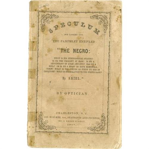 <B>Booklet, <I>Speculum For Looking Into The Pamphlet Entitled 'The Negro:What Is His Ethnological Status, &c…By Ariel</B></I>,</B></I> by Optician (Charleston, South Carolina: Joseph Walker, 1867), 27 pp, 5” x 7.5”, paper covers. Some chipping to extremities, light foxing, overall browning with old tape repairs to spine. Good condition. A fascinating rebuff to an earlier racist pamphlet written by Buckner H. Payne under the pseudonym “Ariel”. Payne argued that Africans are simply beasts whereas the pamphlet offered here stresses equality. The social upheaval resulting from emancipation renewed this old argument, especially since Republicans were pushing for Negro suffrage in a defeated South. <BR><BR><b>Shipping:</b> Books & Catalogs (<a target="_blank" href="http://www.heritageauctions.com/common/shipping.php">view shipping information</a>)