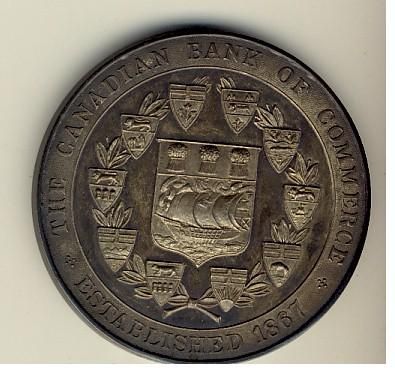 1867 Canadian Bank of Commerce Silver Medal. Commerative medal presented to Kathleen M Whitney on June 1919. Weighs 87 gr. (sterling) and depicts a circle of shields.