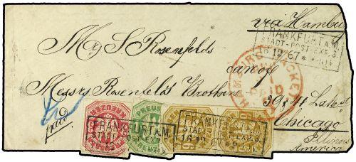 1867 Envelope to Chicago franked imperf 1kr, 2kr + pair 9kr. tied by boxed Frankfurt date stamp. Obverse also bears red HAMBURG PACKET 3 transit date stamp and accountancy mark. Full Flemming (2000) certificate.