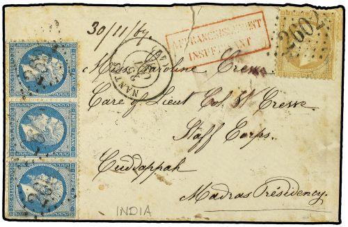 1867 Envelope to Cuddappah, India, franked strip of three 20c. + 10c. Napoleon tied Nantes numeral cancel ´2602´. Obverse also bears red boxed "Affranchissement/Insuffisant". On reverse, segmented box "Madras/Steam Letter" + 8a. 8pies ms. charge.