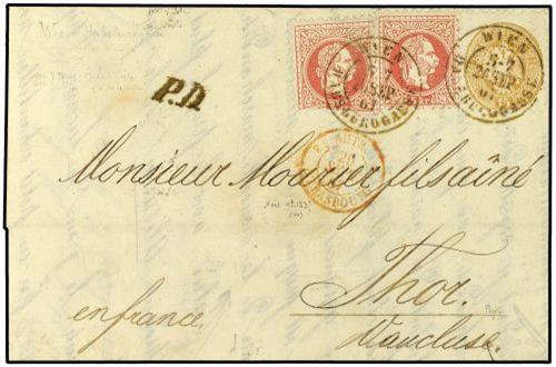 1867 Envelope to FRANCE bearing Arms 15 Kr bistre mixed with Franz Joseph 5 Kr red (2) (Yvert 31, 34) tied by WIEN HABSBERGGASSE double ring with PD and French entry cachet and THOR arrival on reverse. Nice mixed combination. Cat. Ferchenbauer $1500.