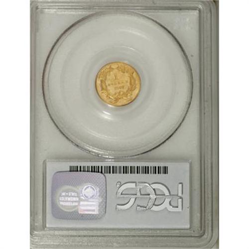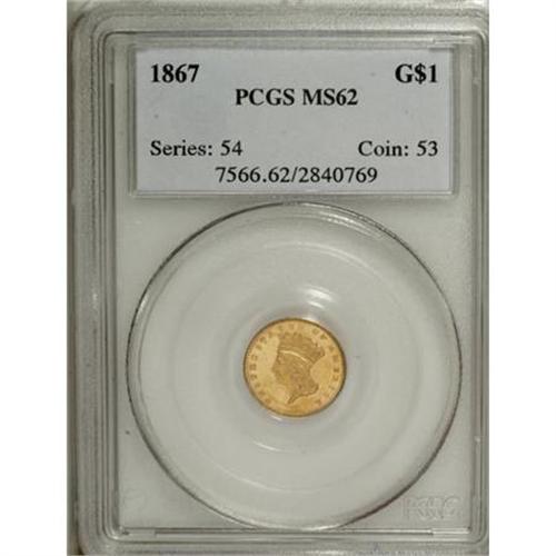 <B>1867 G$1 MS62 PCGS.</B></I> Pleasing orange-gold patina bathes each side of this sharply impressed gold dollar. A mild cameo-like appearance between the lightly frosted motifs and somewhat prooflike fields results when the coin is viewed at various angles. A few wispy handling marks do not distract. This piece clearly shows the word LIBERTY imposed on the reverse between the wreath and date, the result of die clashing. A very sharp coin for the grade. Population: 13 in 62, 23 finer (8/07).<BR><BR><BR><B>Coin Engraver:</B> James B. Longacre<BR><BR><b>Shipping:</b> Coins & Currency (<a target="_blank" href="http://www.heritageauctions.com/common/shipping.php">view shipping information</a>)