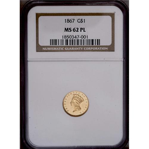 1867 G$1 MS62 Prooflike NGC. Only 5,200 business strik