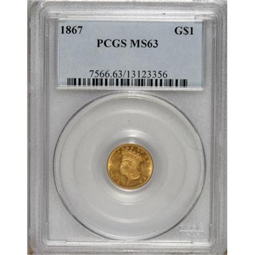 <B>1867 G$1 MS63 PCGS.</B></I> This low mintage gold dollar is scarce in all grades, yet remains affordable. A smooth and suitably struck example. All letters in LIBERTY are legible beneath the date, the result of clashed dies. Population: 4 in 63, 18 finer (4/07).<BR><BR><b>Shipping:</b> Coins & Currency (<a target="_blank" href="http://www.heritageauctions.com/common/shipping.php">view shipping information</a>)