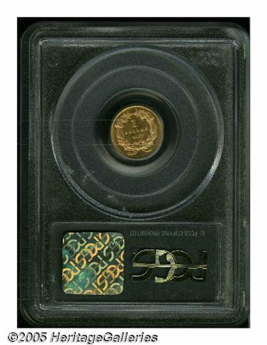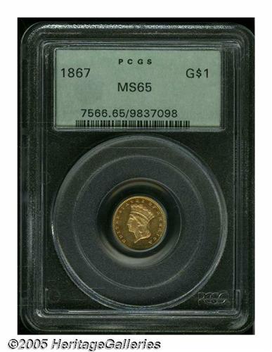 <B>1867<G$1> MS65 PCGS.</B></I> A frosty bright Gem that retains ample mint bloom and eye appeal. There are a couple of minute ticks on Liberty's face, but the fields are very clean. Coppery-gold toning and scarce in this grade. The obverse and reverse both show strong clashmarks. Population: 5 in 65, 5 finer (6/05).