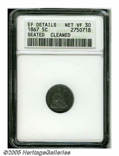 <B>1867<H10C>--Cleaned--ANACS. XF Details, Net VF30.</B></I> Semi-bright surfaces display light hairlines on the obverse, and are toned in cobalt-blue and rose over both sides. The design elements display nice definition, and just a couple of minute marks are seen over each side.