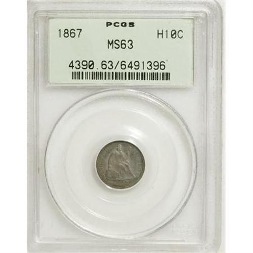 <B>1867 H10C MS63 PCGS.</B></I> Deep sea-green and chestnut toning. The centers are incompletely impressed. The obverse is multiply clashed. A mere 8,000 pieces were struck, since half dimes were driven out of circulation by fractional currency. In an older green label holder.<BR><BR><B>Coin Engraver:</B> Christian Gobrecht<BR><BR><b>Shipping:</b> Coins & Currency (<a target="_blank" href="http://www.heritageauctions.com/common/shipping.php">view shipping information</a>)