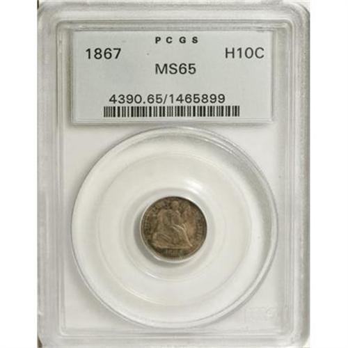 <B>1867 H10C MS65 PCGS.</B></I> One of the best-preserved survivors from an issue of just 8,000 pieces, this Gem post-war half dime displays dappled green-gold and lilac-blue tints. Crisply struck with enticing luster. Population: 8 in 65, 7 finer (8/07).<B><BR></B></I><I>From The Beau Clerc Collection.</B></I><BR><BR><B>Coin Engraver:</B> Christian Gobrecht<BR><BR><b>Shipping:</b> Coins & Currency (<a target="_blank" href="http://www.heritageauctions.com/common/shipping.php">view shipping information</a>)